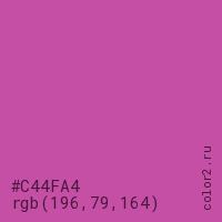 Цвет #C44FA4 в цветовой модели RGB обозначается тремя октетами (196, 79, 164) в десятичном формате и #C44FA4 в шестнадцатиричном (hex) формате, которые являются интенсивностью красного 196 (hex C4), интенсивность зелёного 79 (hex 4F) и интенсивность синего 164 (hex A4).