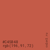 Цвет #C45B48 в цветовой модели RGB обозначается тремя октетами (196, 91, 72) в десятичном формате и #C45B48 в шестнадцатиричном (hex) формате, которые являются интенсивностью красного 196 (hex C4), интенсивность зелёного 91 (hex 5B) и интенсивность синего 72 (hex 48).