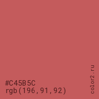 Цвет #C45B5C в цветовой модели RGB обозначается тремя октетами (196, 91, 92) в десятичном формате и #C45B5C в шестнадцатиричном (hex) формате, которые являются интенсивностью красного 196 (hex C4), интенсивность зелёного 91 (hex 5B) и интенсивность синего 92 (hex 5C).