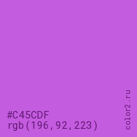 Цвет #C45CDF в цветовой модели RGB обозначается тремя октетами (196, 92, 223) в десятичном формате и #C45CDF в шестнадцатиричном (hex) формате, которые являются интенсивностью красного 196 (hex C4), интенсивность зелёного 92 (hex 5C) и интенсивность синего 223 (hex DF).