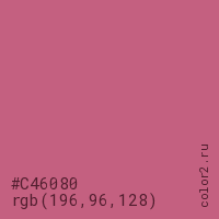 Цвет #C46080 в цветовой модели RGB обозначается тремя октетами (196, 96, 128) в десятичном формате и #C46080 в шестнадцатиричном (hex) формате, которые являются интенсивностью красного 196 (hex C4), интенсивность зелёного 96 (hex 60) и интенсивность синего 128 (hex 80).
