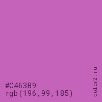 Цвет #C463B9 в цветовой модели RGB обозначается тремя октетами (196, 99, 185) в десятичном формате и #C463B9 в шестнадцатиричном (hex) формате, которые являются интенсивностью красного 196 (hex C4), интенсивность зелёного 99 (hex 63) и интенсивность синего 185 (hex B9).