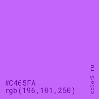 Цвет #C465FA в цветовой модели RGB обозначается тремя октетами (196, 101, 250) в десятичном формате и #C465FA в шестнадцатиричном (hex) формате, которые являются интенсивностью красного 196 (hex C4), интенсивность зелёного 101 (hex 65) и интенсивность синего 250 (hex FA).