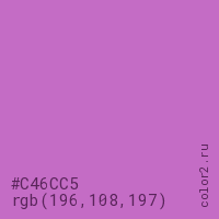 Цвет #C46CC5 в цветовой модели RGB обозначается тремя октетами (196, 108, 197) в десятичном формате и #C46CC5 в шестнадцатиричном (hex) формате, которые являются интенсивностью красного 196 (hex C4), интенсивность зелёного 108 (hex 6C) и интенсивность синего 197 (hex C5).
