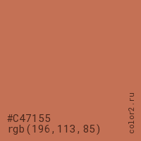 Цвет #C47155 в цветовой модели RGB обозначается тремя октетами (196, 113, 85) в десятичном формате и #C47155 в шестнадцатиричном (hex) формате, которые являются интенсивностью красного 196 (hex C4), интенсивность зелёного 113 (hex 71) и интенсивность синего 85 (hex 55).