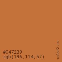 Цвет #C47239 в цветовой модели RGB обозначается тремя октетами (196, 114, 57) в десятичном формате и #C47239 в шестнадцатиричном (hex) формате, которые являются интенсивностью красного 196 (hex C4), интенсивность зелёного 114 (hex 72) и интенсивность синего 57 (hex 39).