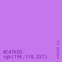 Цвет #C476ED в цветовой модели RGB обозначается тремя октетами (196, 118, 237) в десятичном формате и #C476ED в шестнадцатиричном (hex) формате, которые являются интенсивностью красного 196 (hex C4), интенсивность зелёного 118 (hex 76) и интенсивность синего 237 (hex ED).