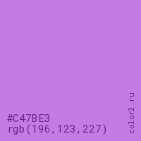 Цвет #C47BE3 в цветовой модели RGB обозначается тремя октетами (196, 123, 227) в десятичном формате и #C47BE3 в шестнадцатиричном (hex) формате, которые являются интенсивностью красного 196 (hex C4), интенсивность зелёного 123 (hex 7B) и интенсивность синего 227 (hex E3).