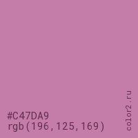 Цвет #C47DA9 в цветовой модели RGB обозначается тремя октетами (196, 125, 169) в десятичном формате и #C47DA9 в шестнадцатиричном (hex) формате, которые являются интенсивностью красного 196 (hex C4), интенсивность зелёного 125 (hex 7D) и интенсивность синего 169 (hex A9).