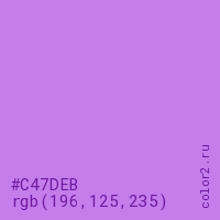 Цвет #C47DEB в цветовой модели RGB обозначается тремя октетами (196, 125, 235) в десятичном формате и #C47DEB в шестнадцатиричном (hex) формате, которые являются интенсивностью красного 196 (hex C4), интенсивность зелёного 125 (hex 7D) и интенсивность синего 235 (hex EB).