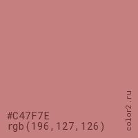 Цвет #C47F7E в цветовой модели RGB обозначается тремя октетами (196, 127, 126) в десятичном формате и #C47F7E в шестнадцатиричном (hex) формате, которые являются интенсивностью красного 196 (hex C4), интенсивность зелёного 127 (hex 7F) и интенсивность синего 126 (hex 7E).