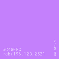 Цвет #C480FC в цветовой модели RGB обозначается тремя октетами (196, 128, 252) в десятичном формате и #C480FC в шестнадцатиричном (hex) формате, которые являются интенсивностью красного 196 (hex C4), интенсивность зелёного 128 (hex 80) и интенсивность синего 252 (hex FC).
