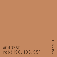Цвет #C4875F в цветовой модели RGB обозначается тремя октетами (196, 135, 95) в десятичном формате и #C4875F в шестнадцатиричном (hex) формате, которые являются интенсивностью красного 196 (hex C4), интенсивность зелёного 135 (hex 87) и интенсивность синего 95 (hex 5F).