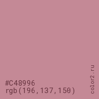 Цвет #C48996 в цветовой модели RGB обозначается тремя октетами (196, 137, 150) в десятичном формате и #C48996 в шестнадцатиричном (hex) формате, которые являются интенсивностью красного 196 (hex C4), интенсивность зелёного 137 (hex 89) и интенсивность синего 150 (hex 96).