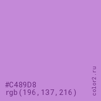 Цвет #C489D8 в цветовой модели RGB обозначается тремя октетами (196, 137, 216) в десятичном формате и #C489D8 в шестнадцатиричном (hex) формате, которые являются интенсивностью красного 196 (hex C4), интенсивность зелёного 137 (hex 89) и интенсивность синего 216 (hex D8).