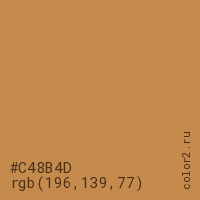Цвет #C48B4D в цветовой модели RGB обозначается тремя октетами (196, 139, 77) в десятичном формате и #C48B4D в шестнадцатиричном (hex) формате, которые являются интенсивностью красного 196 (hex C4), интенсивность зелёного 139 (hex 8B) и интенсивность синего 77 (hex 4D).