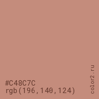 Цвет #C48C7C в цветовой модели RGB обозначается тремя октетами (196, 140, 124) в десятичном формате и #C48C7C в шестнадцатиричном (hex) формате, которые являются интенсивностью красного 196 (hex C4), интенсивность зелёного 140 (hex 8C) и интенсивность синего 124 (hex 7C).