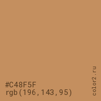 Цвет #C48F5F в цветовой модели RGB обозначается тремя октетами (196, 143, 95) в десятичном формате и #C48F5F в шестнадцатиричном (hex) формате, которые являются интенсивностью красного 196 (hex C4), интенсивность зелёного 143 (hex 8F) и интенсивность синего 95 (hex 5F).