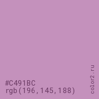 Цвет #C491BC в цветовой модели RGB обозначается тремя октетами (196, 145, 188) в десятичном формате и #C491BC в шестнадцатиричном (hex) формате, которые являются интенсивностью красного 196 (hex C4), интенсивность зелёного 145 (hex 91) и интенсивность синего 188 (hex BC).