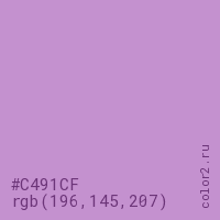 Цвет #C491CF в цветовой модели RGB обозначается тремя октетами (196, 145, 207) в десятичном формате и #C491CF в шестнадцатиричном (hex) формате, которые являются интенсивностью красного 196 (hex C4), интенсивность зелёного 145 (hex 91) и интенсивность синего 207 (hex CF).