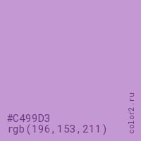 Цвет #C499D3 в цветовой модели RGB обозначается тремя октетами (196, 153, 211) в десятичном формате и #C499D3 в шестнадцатиричном (hex) формате, которые являются интенсивностью красного 196 (hex C4), интенсивность зелёного 153 (hex 99) и интенсивность синего 211 (hex D3).