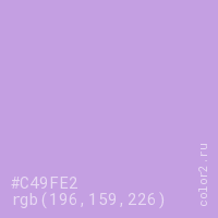 Цвет #C49FE2 в цветовой модели RGB обозначается тремя октетами (196, 159, 226) в десятичном формате и #C49FE2 в шестнадцатиричном (hex) формате, которые являются интенсивностью красного 196 (hex C4), интенсивность зелёного 159 (hex 9F) и интенсивность синего 226 (hex E2).