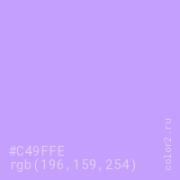 Цвет #C49FFE в цветовой модели RGB обозначается тремя октетами (196, 159, 254) в десятичном формате и #C49FFE в шестнадцатиричном (hex) формате, которые являются интенсивностью красного 196 (hex C4), интенсивность зелёного 159 (hex 9F) и интенсивность синего 254 (hex FE).