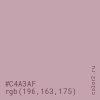 Цвет #C4A3AF в цветовой модели RGB обозначается тремя октетами (196, 163, 175) в десятичном формате и #C4A3AF в шестнадцатиричном (hex) формате, которые являются интенсивностью красного 196 (hex C4), интенсивность зелёного 163 (hex A3) и интенсивность синего 175 (hex AF).