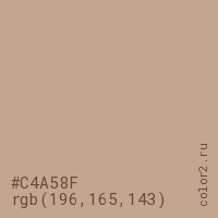 Цвет #C4A58F в цветовой модели RGB обозначается тремя октетами (196, 165, 143) в десятичном формате и #C4A58F в шестнадцатиричном (hex) формате, которые являются интенсивностью красного 196 (hex C4), интенсивность зелёного 165 (hex A5) и интенсивность синего 143 (hex 8F).