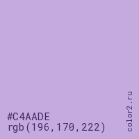 Цвет #C4AADE в цветовой модели RGB обозначается тремя октетами (196, 170, 222) в десятичном формате и #C4AADE в шестнадцатиричном (hex) формате, которые являются интенсивностью красного 196 (hex C4), интенсивность зелёного 170 (hex AA) и интенсивность синего 222 (hex DE).
