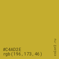 Цвет #C4AD2E в цветовой модели RGB обозначается тремя октетами (196, 173, 46) в десятичном формате и #C4AD2E в шестнадцатиричном (hex) формате, которые являются интенсивностью красного 196 (hex C4), интенсивность зелёного 173 (hex AD) и интенсивность синего 46 (hex 2E).