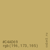 Цвет #C4AD69 в цветовой модели RGB обозначается тремя октетами (196, 173, 105) в десятичном формате и #C4AD69 в шестнадцатиричном (hex) формате, которые являются интенсивностью красного 196 (hex C4), интенсивность зелёного 173 (hex AD) и интенсивность синего 105 (hex 69).