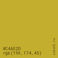 Цвет #C4AE2D в цветовой модели RGB обозначается тремя октетами (196, 174, 45) в десятичном формате и #C4AE2D в шестнадцатиричном (hex) формате, которые являются интенсивностью красного 196 (hex C4), интенсивность зелёного 174 (hex AE) и интенсивность синего 45 (hex 2D).