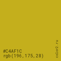 Цвет #C4AF1C в цветовой модели RGB обозначается тремя октетами (196, 175, 28) в десятичном формате и #C4AF1C в шестнадцатиричном (hex) формате, которые являются интенсивностью красного 196 (hex C4), интенсивность зелёного 175 (hex AF) и интенсивность синего 28 (hex 1C).