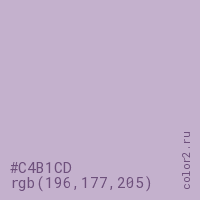 Цвет #C4B1CD в цветовой модели RGB обозначается тремя октетами (196, 177, 205) в десятичном формате и #C4B1CD в шестнадцатиричном (hex) формате, которые являются интенсивностью красного 196 (hex C4), интенсивность зелёного 177 (hex B1) и интенсивность синего 205 (hex CD).