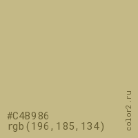 Цвет #C4B986 в цветовой модели RGB обозначается тремя октетами (196, 185, 134) в десятичном формате и #C4B986 в шестнадцатиричном (hex) формате, которые являются интенсивностью красного 196 (hex C4), интенсивность зелёного 185 (hex B9) и интенсивность синего 134 (hex 86).