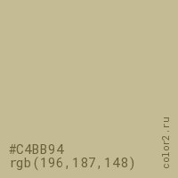 Цвет #C4BB94 в цветовой модели RGB обозначается тремя октетами (196, 187, 148) в десятичном формате и #C4BB94 в шестнадцатиричном (hex) формате, которые являются интенсивностью красного 196 (hex C4), интенсивность зелёного 187 (hex BB) и интенсивность синего 148 (hex 94).