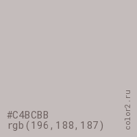 Цвет #C4BCBB в цветовой модели RGB обозначается тремя октетами (196, 188, 187) в десятичном формате и #C4BCBB в шестнадцатиричном (hex) формате, которые являются интенсивностью красного 196 (hex C4), интенсивность зелёного 188 (hex BC) и интенсивность синего 187 (hex BB).