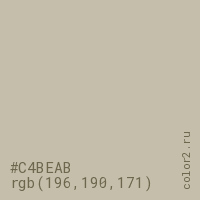 Цвет #C4BEAB в цветовой модели RGB обозначается тремя октетами (196, 190, 171) в десятичном формате и #C4BEAB в шестнадцатиричном (hex) формате, которые являются интенсивностью красного 196 (hex C4), интенсивность зелёного 190 (hex BE) и интенсивность синего 171 (hex AB).