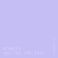 Цвет #C4BEF5 в цветовой модели RGB обозначается тремя октетами (196, 190, 245) в десятичном формате и #C4BEF5 в шестнадцатиричном (hex) формате, которые являются интенсивностью красного 196 (hex C4), интенсивность зелёного 190 (hex BE) и интенсивность синего 245 (hex F5).