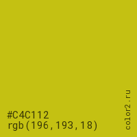 Цвет #C4C112 в цветовой модели RGB обозначается тремя октетами (196, 193, 18) в десятичном формате и #C4C112 в шестнадцатиричном (hex) формате, которые являются интенсивностью красного 196 (hex C4), интенсивность зелёного 193 (hex C1) и интенсивность синего 18 (hex 12).