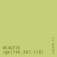 Цвет #C4CF76 в цветовой модели RGB обозначается тремя октетами (196, 207, 118) в десятичном формате и #C4CF76 в шестнадцатиричном (hex) формате, которые являются интенсивностью красного 196 (hex C4), интенсивность зелёного 207 (hex CF) и интенсивность синего 118 (hex 76).
