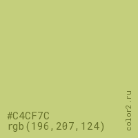 Цвет #C4CF7C в цветовой модели RGB обозначается тремя октетами (196, 207, 124) в десятичном формате и #C4CF7C в шестнадцатиричном (hex) формате, которые являются интенсивностью красного 196 (hex C4), интенсивность зелёного 207 (hex CF) и интенсивность синего 124 (hex 7C).