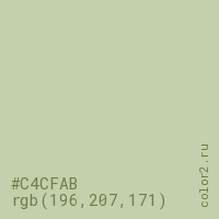 Цвет #C4CFAB в цветовой модели RGB обозначается тремя октетами (196, 207, 171) в десятичном формате и #C4CFAB в шестнадцатиричном (hex) формате, которые являются интенсивностью красного 196 (hex C4), интенсивность зелёного 207 (hex CF) и интенсивность синего 171 (hex AB).