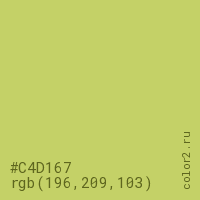 Цвет #C4D167 в цветовой модели RGB обозначается тремя октетами (196, 209, 103) в десятичном формате и #C4D167 в шестнадцатиричном (hex) формате, которые являются интенсивностью красного 196 (hex C4), интенсивность зелёного 209 (hex D1) и интенсивность синего 103 (hex 67).
