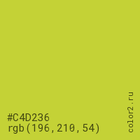 Цвет #C4D236 в цветовой модели RGB обозначается тремя октетами (196, 210, 54) в десятичном формате и #C4D236 в шестнадцатиричном (hex) формате, которые являются интенсивностью красного 196 (hex C4), интенсивность зелёного 210 (hex D2) и интенсивность синего 54 (hex 36).