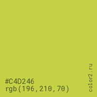 Цвет #C4D246 в цветовой модели RGB обозначается тремя октетами (196, 210, 70) в десятичном формате и #C4D246 в шестнадцатиричном (hex) формате, которые являются интенсивностью красного 196 (hex C4), интенсивность зелёного 210 (hex D2) и интенсивность синего 70 (hex 46).