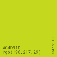 Цвет #C4D91D в цветовой модели RGB обозначается тремя октетами (196, 217, 29) в десятичном формате и #C4D91D в шестнадцатиричном (hex) формате, которые являются интенсивностью красного 196 (hex C4), интенсивность зелёного 217 (hex D9) и интенсивность синего 29 (hex 1D).