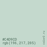 Цвет #C4D9CD в цветовой модели RGB обозначается тремя октетами (196, 217, 205) в десятичном формате и #C4D9CD в шестнадцатиричном (hex) формате, которые являются интенсивностью красного 196 (hex C4), интенсивность зелёного 217 (hex D9) и интенсивность синего 205 (hex CD).