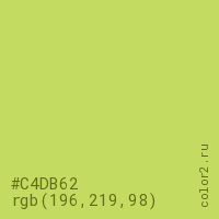 Цвет #C4DB62 в цветовой модели RGB обозначается тремя октетами (196, 219, 98) в десятичном формате и #C4DB62 в шестнадцатиричном (hex) формате, которые являются интенсивностью красного 196 (hex C4), интенсивность зелёного 219 (hex DB) и интенсивность синего 98 (hex 62).